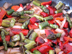 Mettre les asperges dans une poêle chaude avec un filet d’huile d’olive, ajouter les poivrons découpés grossièrement et les faire griller coté peau avec les asperges.